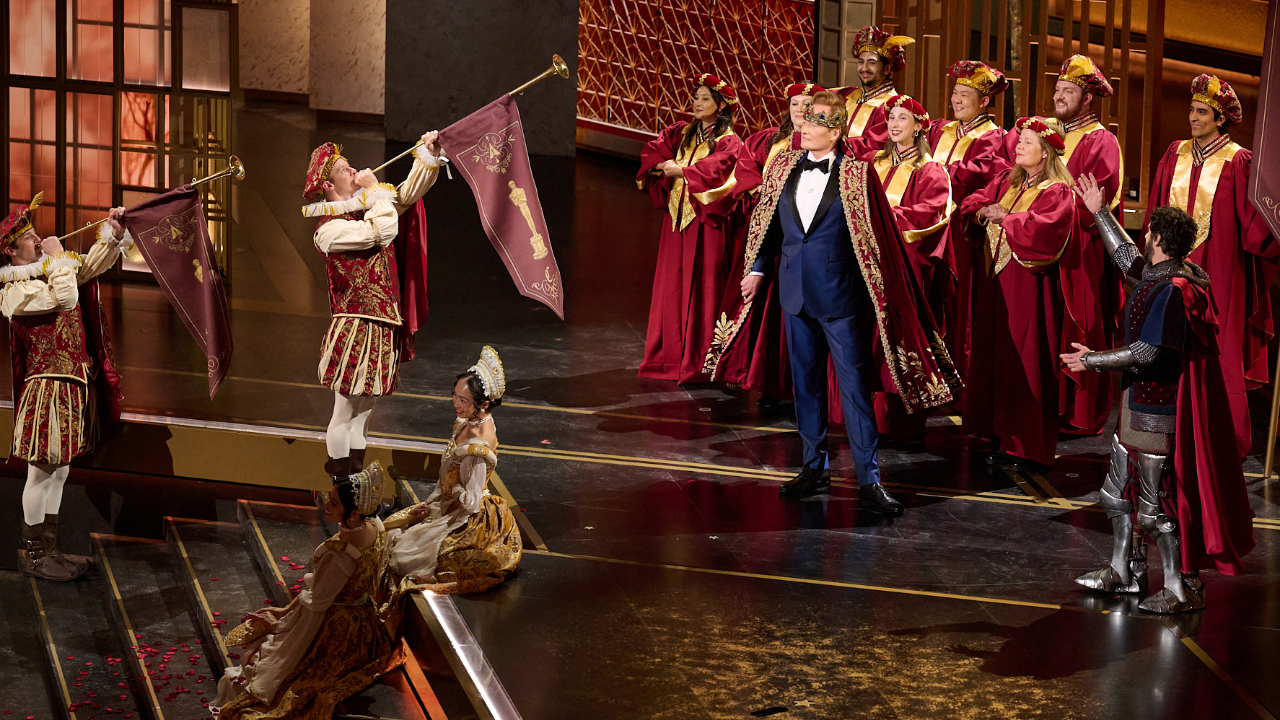 “O presidente‑executivo da Netflix, Ted Sarandos, está aqui, e isto é entusiasmante: é a sua primeira vez num cinema. ‘É disto que falam? Porque estão juntos a divertir‑se? Deviam estar sozinhos em casa!’”, brincou O’Brien sobre a plataforma de streaming durante o monólogo de abertura.
